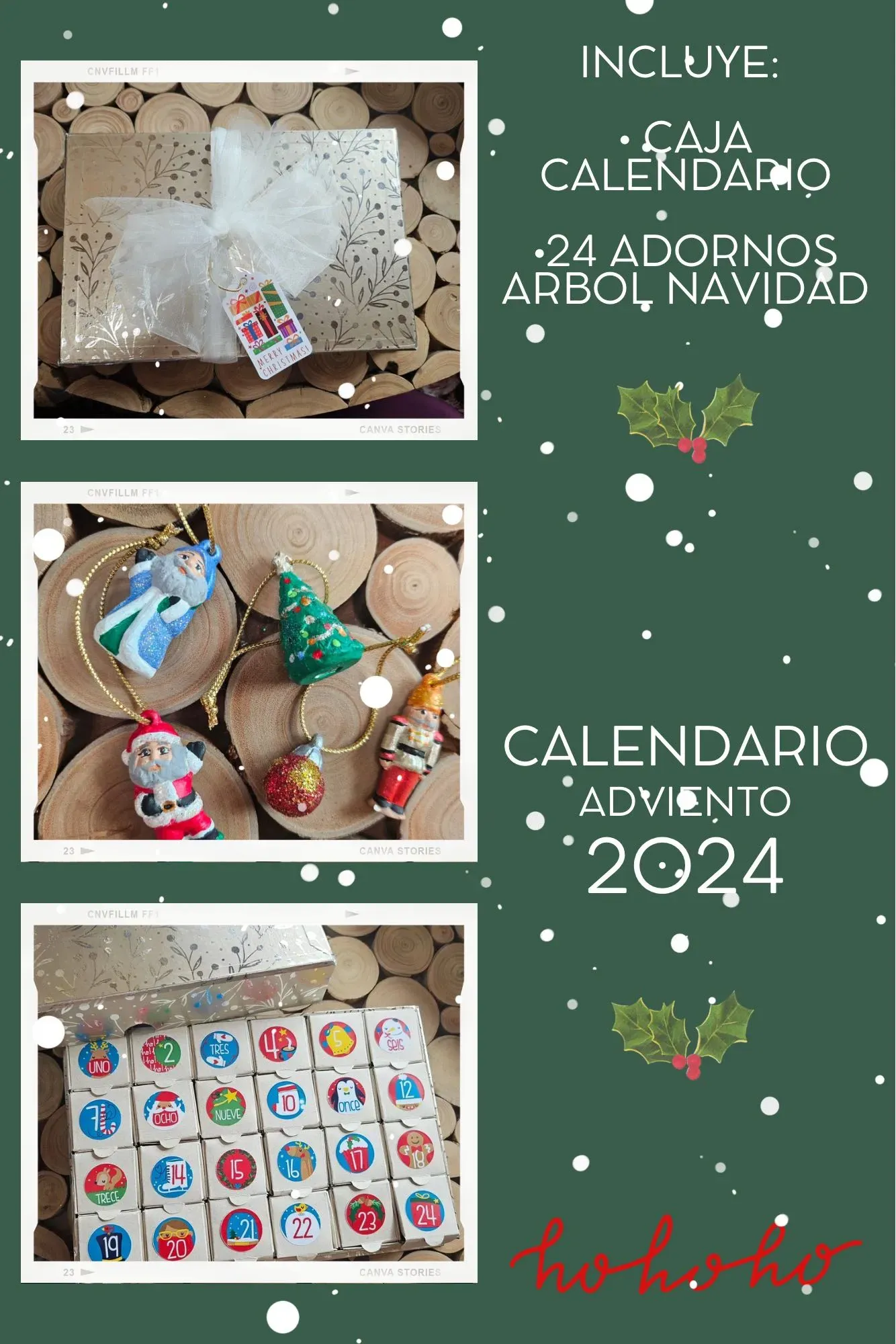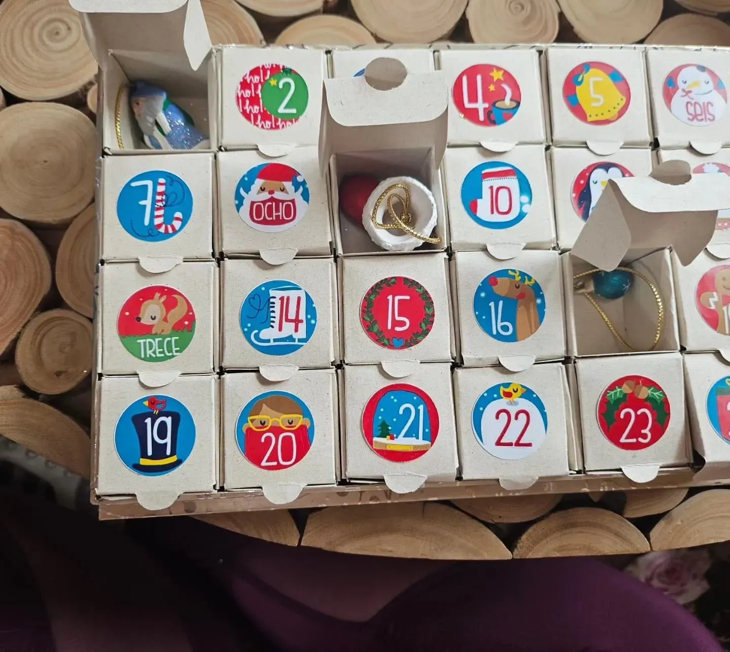 Incluye caja, y 24 figuras para colgar en el árbol de navidad. Cada día se abre una caja y aparece un adorno para el árbol.
